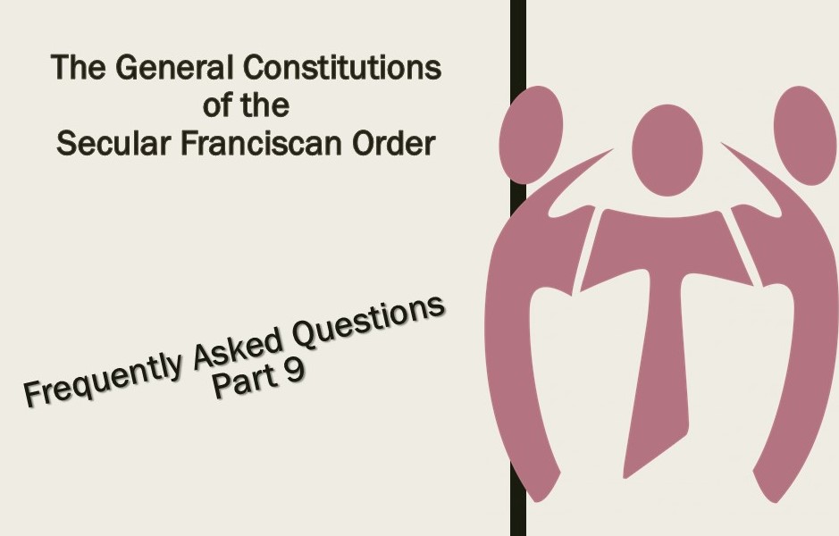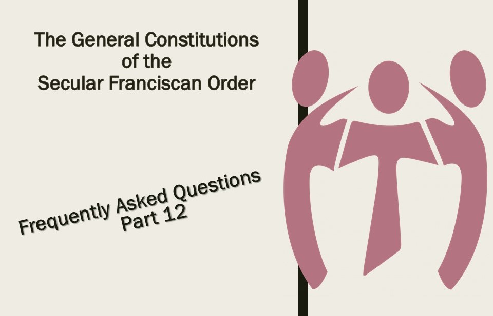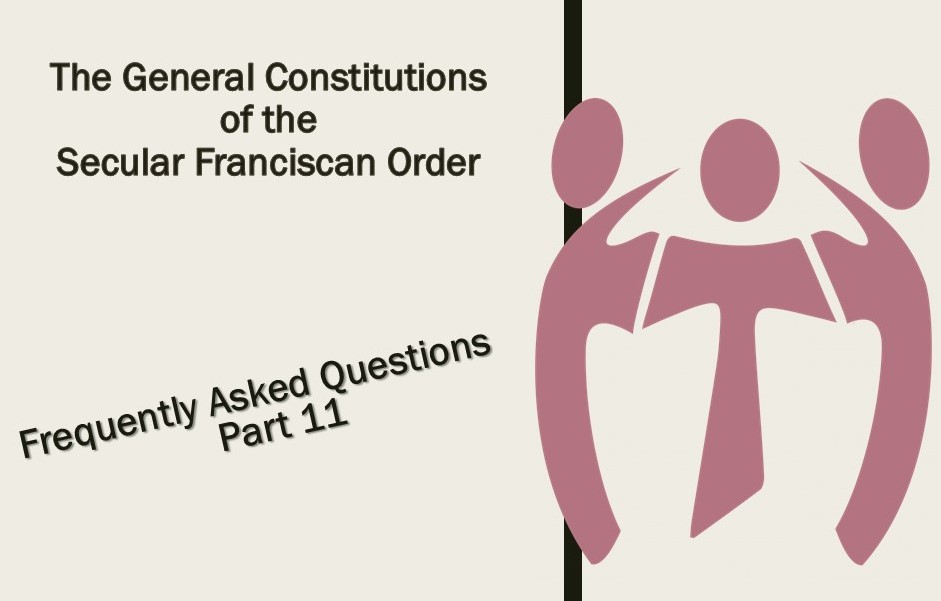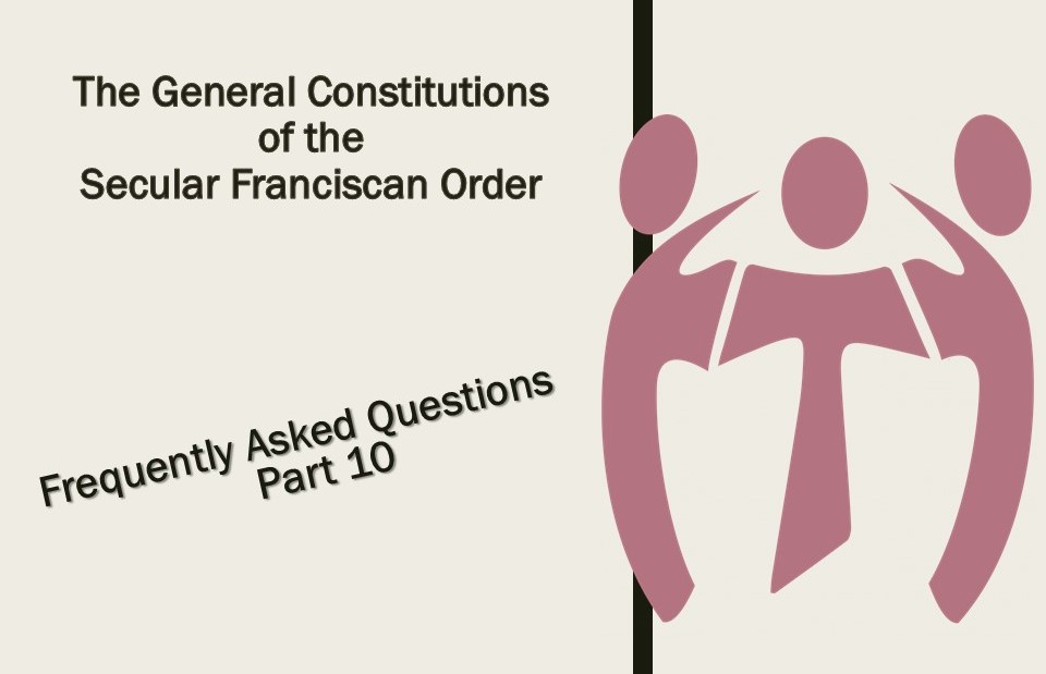 Frequently Asked Questions answered by our General Constitutions (GC): This week, and for several more, we continue to spotlight the questions given in the 2010 edition of the Handbook for Servant Leadership. Becoming familiar with the Constitutions is very helpful in addressing these questions and others that arise in fraternities at all levels. For the complete, latest translation of the entire document, visit: https://ciofs.info/library/official-documents/ or https://www.secularfranciscansusa.org/the-general-constitutions-of-the-secular-franciscan-order-2000/