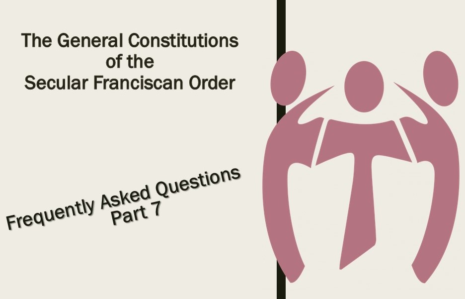 Preguntas Frecuentes Respondidas por nuestras Constituciones Generales (CG): Esta semana, y por varias más, volvemos a las preguntas dadas en la edición 2010 del Manual para el Liderazgo de Servicio. Las mismas preguntas surgen a menudo en nuestros consejos y en nuestras fraternidades. Familiarizarse con las Constituciones es muy útil para abordar los problemas que surgen en las fraternidades a todos los niveles. Para obtener la traducción completa y más reciente del documento completo, visite:: https://ciofs.info/wp-content/uploads/2021/01/ES-Constituciones-generales-OFS-s.pdf