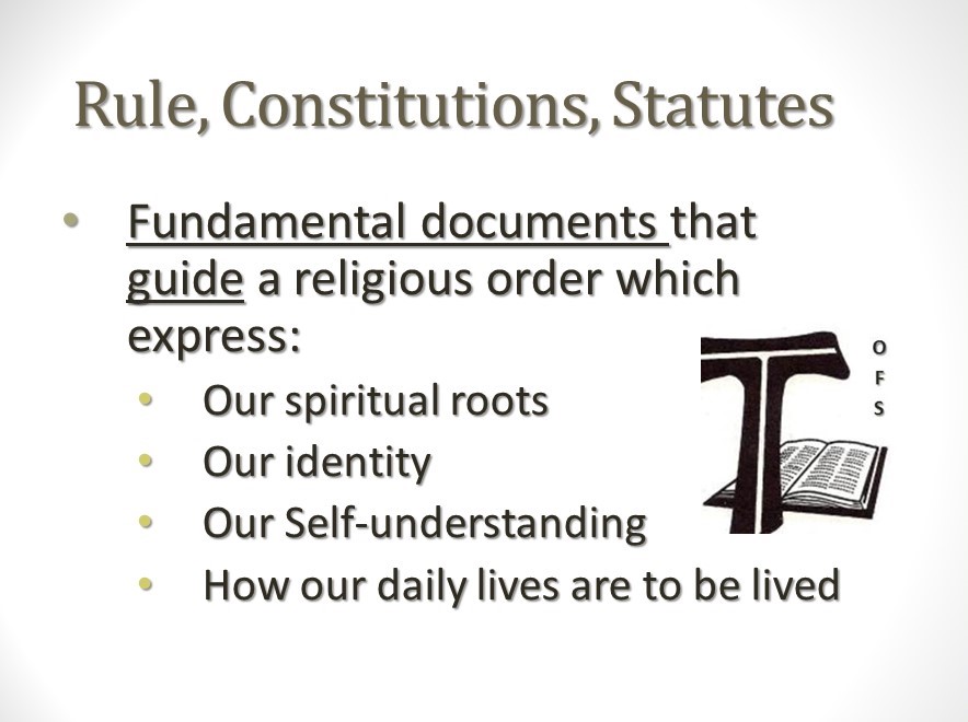“The word ‘rule’ (Latin: regula, Greek: kanon) literally means a standard by which something can be tested. In the case of religious or secular institutes it establishes the spiritual foundation and identity of the community. It is the norm which all the other documentation of the institutes – constitutions, statutes, etc. – are measured. Approbation of rules for religious and secular institutes in the Church is reserved to the Holy See.” (See Michael Higgins, TOR, “Importance of Familiarization with the Documents of the Secular Franciscan Order.”)