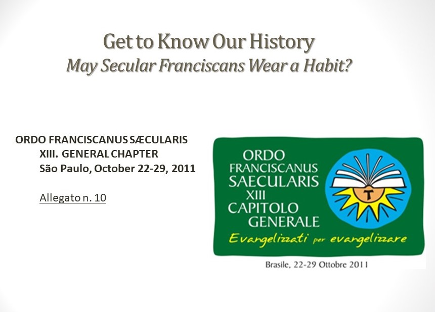 History of our Order: Use of the “habit” by Secular FranciscansIt is important for us to be aware of the history of our Order and why we do and do not do certain things. Here you can read the official document telling us that it was decided in 2011 that we are not to wear a habit. Many of us know this, some wonder about it, and new members hear about it and might not understand what we are talking about. So, here is a piece of our history.For reference: Article 5.2 of the General Constitutions states, “The practical interpretation of the Constitutions, with the purpose of harmonizing its application in different areas and at the various levels of the Order, belongs to the General Chapter of the OFS.”In the United States (and many other countries) the TAU cross is our distinctive sign of membership in the Order.The General Chapter makes the followingDECISIONThe practice of wearing a “habit” is not in conformity with the Rule and General Constitutions of the OFS, as already established.As a practical interpretation (cf. Art. 5.2 GGCC) of Article 43 of the General Constitutions, the Chapter emphasizes and insists that the distinctive sign of membership in the Order is the “Tau or other Franciscan symbol”. (GGCC 43). A “Franciscan symbol” is a small and simple insignia that is worn on the person (for example, a San Damiano cross).However, an OFS National Fraternity may determine in its National Statutes that the wearing a “uniform” is an acceptable sign of recognition for Secular Franciscans of their own country, providing that the following mandatory criteria is followed:a) the uniform does not replace the TAU or the Franciscan symbol selected by the National Fraternity;b) the nature of the uniform is to be specified in the National Statutes, including a detailed description (preferably graphical) and be of a style that respects the secularity of the members of the Order;c) the style of the uniform should not look like the habit worn by member of a religious Order, so as to avoid bringing confusion between religious and seculars;d) the occasions during which this uniform may be worn must be precisely indicated and specifically excludes its use during the rites of admission and/or profession.The Chapter states that the decision replaces all previous documents in this regard, and becomes in effect now and for the future.d) the occasions during which this uniform may be worn must be precisely indicated and specifically excludes its use during the rites of admission and/or profession.The Chapter states that the decision replaces all previous documents in this regard,and becomes in effect now and for the future.São Paolo, October 29, 2011Encarnación del Pozo, OFS, General Minister+++++++++++++++++++++++++++++++++++Formación 21 de junio, 2024: Por favor, compartir con su fraternidad local.Historia de nuestra Orden: Uso del “hábito” por los franciscanos seglaresEs importante que seamos conscientes de la historia de nuestra Orden y de por qué hacemos y no hacemos ciertas cosas. Aquí puede leer el documento oficial que nos dice que se decidió en 2011 que no debemos usar un hábito. Muchos de nosotros sabemos esto, algunos se preguntan al respecto, y los nuevos miembros se enteran de ello y es posible que no entiendan de qué estamos hablando. Entonces, aquí hay un pedazo de nuestra historia.A modo de referencia: El artículo 5.2 de las Constituciones Generales establece: “La interpretación práctica de las Constituciones, con el fin de armonizar su aplicación en los diversos ámbitos y en las diversas áreas y en los varios niveles de la Orden, corresponde al Capítulo General de la OFS”.En los Estados Unidos (y en muchos otros países) la TAU es nuestro signo distintivo de pertenencia a la Orden.El Capítulo general establece la siguienteDECISIÓNLa práctica de usar un “hábito” no está en conformidad con la Regla y las Constituciones Generales de la OFS, como ya está establecido.Como una interpretación práctica (cfr. Art. 5.2 GGCC) del Artículo 43 de las Constituciones Generales, el Capítulo reitera y confirma que el signo distintivo de pertenencia a la Orden es “la ‘Tau’ u otro símbolo franciscano” (Const. OFS 43). Un “símbolo franciscano” es una insignia pequeña y simple que lleva puesta la persona (por ejemplo, una cruz de San Damián).Sin embargo, una Fraternidad nacional OFS puede determinar en sus Estatutos nacionales que el uso de un “uniforme” puede ser un signo aceptable para distinguir a los franciscanos seglares de su propio país, siempre que los siguientes criterios obligatorios se cumplan:a) el uniforme no sustituye a la TAU ni al símbolo franciscano seleccionado por la Fraternidad Nacional;b) la naturaleza del uniforme se ha de especificar en los Estatutos Nacionales, incluyendo una descripción detallada (preferiblemente gráfica) y debe ser de un estilo que respete la secularidad de los miembros de la Orden;c) el estilo del uniforme no debe verse como el hábito usado por los miembros de una Orden religiosa, con el fin de evitar que se cree confusión entre religiosos y seglares;d) las ocasiones en que se puede usar el uniforme deben indicarse con precisión y excluyendo de modo específico su uso durante los ritos de admisión y / o profesión.El Capítulo establece que esta decisión sustituya todos los documentos anteriores sobre esta cuestión y que entre en vigor desde hoy y para el futuro.São Paolo, 19 de octubre de 2011Encarnación del Pozo, OFSMinistra GeneralDiane F. Menditto, OFSVice Minister, National Fraternity, Secular Franciscan Order USAListen – Discern – Go Forth National Theme 2022-2025