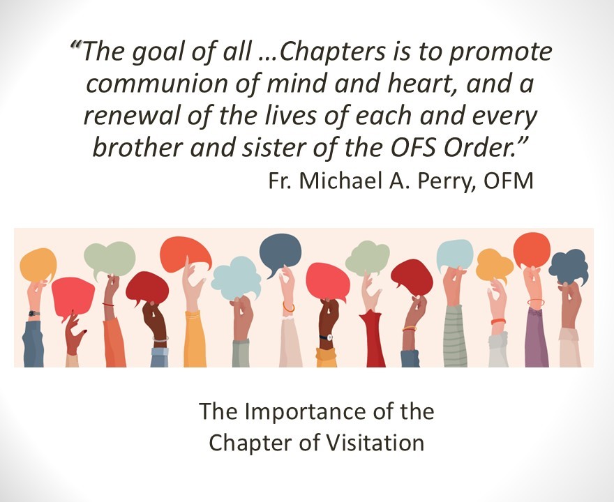 When We Gather in Chapter for the Fraternal and Pastoral VisitationIn the USA, Regional Chapters are held each year and have a profound effect on that region’s members. On the regional level, elections and visitations take place every three years. On the national level, elections also take place every three years, but the visitation by the higher level (CIOFS) takes place only every six years.