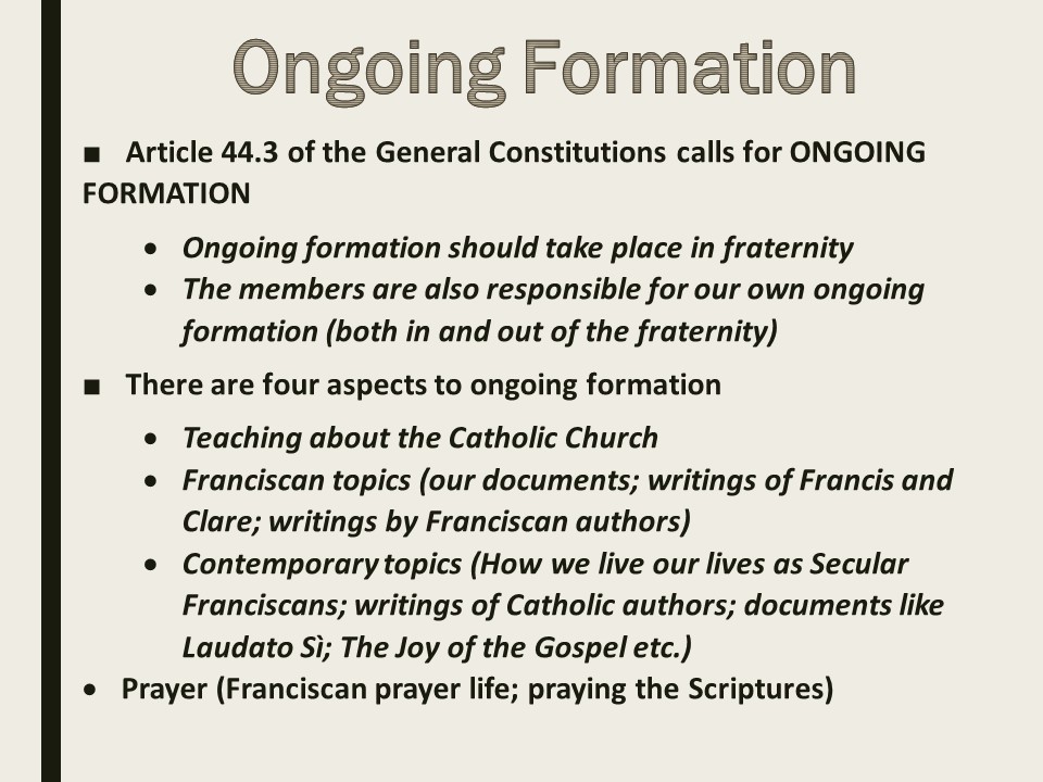 We are all responsible for keeping our vocations strong. Initial formation should not be the last time we think deeply about the Franciscan Charism and all that it means to our lives as Secular Franciscans. Our Constitutions are specific about the need for Ongoing Formation—also called Continuing or Permanent Formation. Take note of what the General Constitutions expect will be the content of our ongoing formation programs: