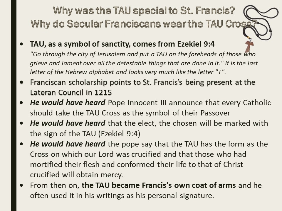 “The Tau Cross [adapted from Catch Me A Rainbow Too by Fr. Lester Bach, O.F.M. Cap.] Franciscans use the Tau as a symbol of commitment to Jesus through the O.F.S. Way of Life. The Tau cross is the sign of the O.F.S. in this country, not the San Damiano crucifix, not a medal of St. Francis, not a scapular and cord (such as were mandated under the Rule of 1883), and not a modified religious habit such as the friars wear! The Tau is worn with pride and joy. Francis saw the Tau as a symbol of the cross of Christ. It was the sign of salvation. It was a sign of belonging to God, being chosen and saved. Francis embraced it with love. It was pregnant with meaning for him. Franciscans wear it as a sign of their commitment to Jesus and the Gospel way of life.”