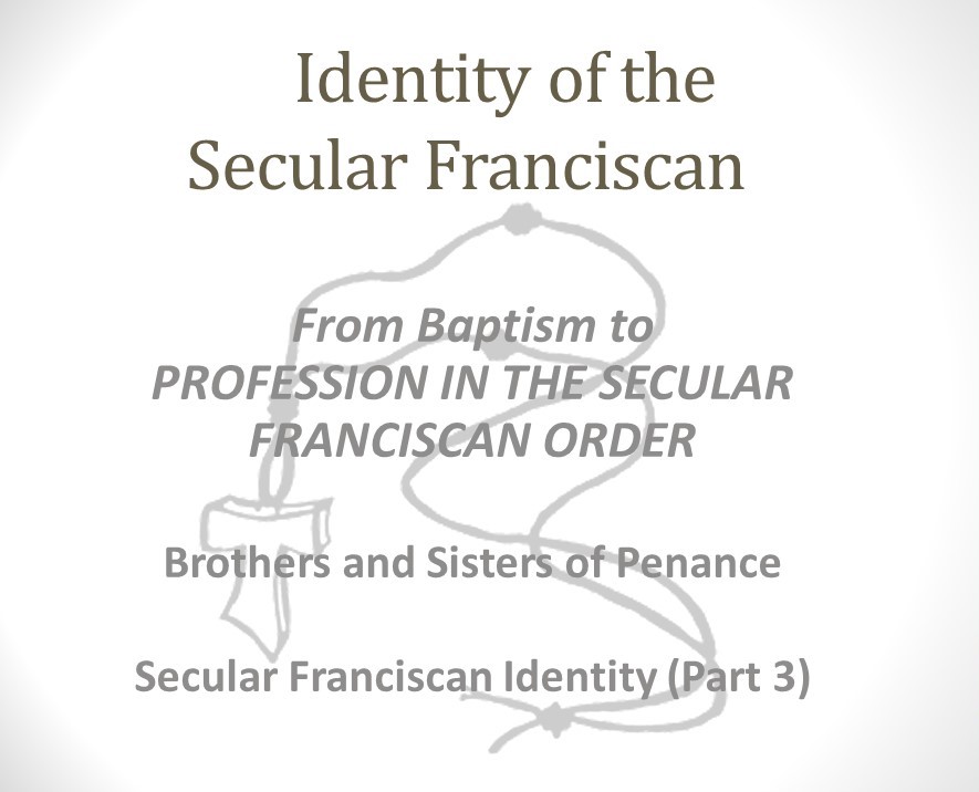 Dear Brothers and Sisters,Today’s lesson is Part 2 or 3 lessons that focus upon our identity as Secular Franciscans. We live in the world, our home, and where we serve the Lord. How do we strive for Perfect Charity in our daily lives? Our Rule, the Gospels, and the constitution help us to navigate our way.We can use this lesson for personal reflection and journaling. If you wish to use this topic as an ongoing formation, it would be best to use all three parts together. (Part 3 comes next week.)P.S. I appreciated those who responded to last week’s lesson and to those who asked for various resources. We always do better when we communicate and share. Peace, Dona++++++++++++++++++++++++++++++++++++++++++++++++++++++++++++++++++++++++++++++++++++++++++++++++++Our Identity as Secular Franciscans—From Baptism to Profession (Part 2 of 3)[For personal formation take each part separately. For ongoing formation, all three parts will be useful when presented together and discussed.]