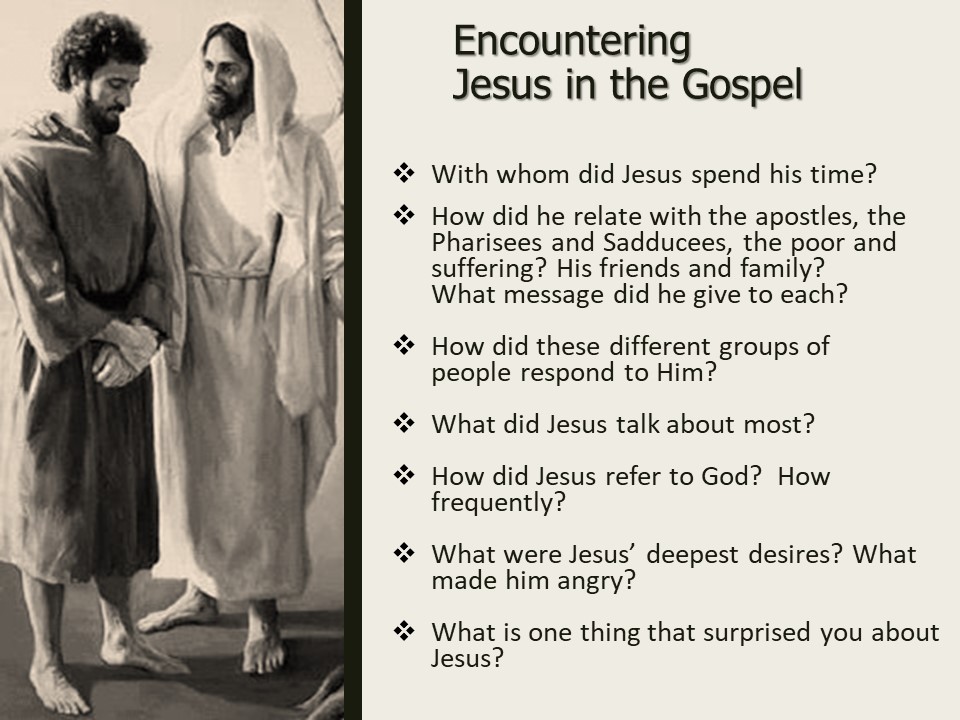 +Lea uno de los evangelios sinópticos (Mateo, Marcos o Lucas). Mientras lees, concéntrese en la persona de Jesús y luego platique o responda a estas preguntas en su diario: