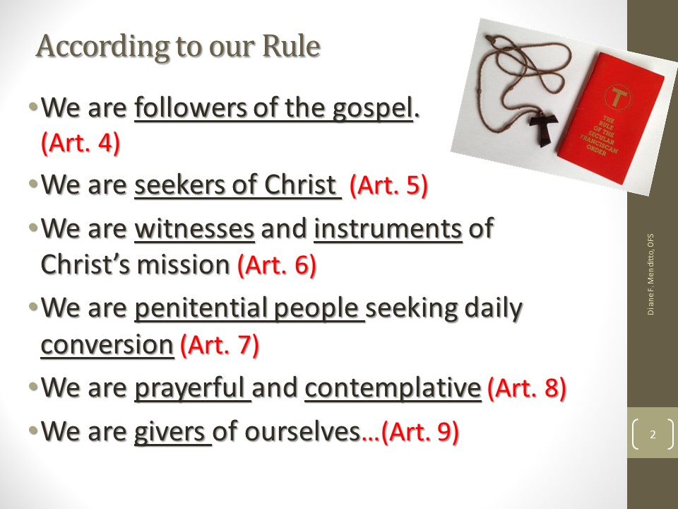 - + We are the “brothers and sisters of penance”…this is the hallmark of the Secular Franciscan. We are on a road and the fuel that propels us is DAILY CONVERSION. Everything we say and do should be opening us to the transforming power of the Holy Spirit.