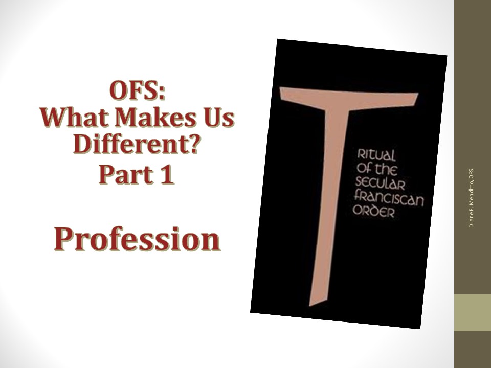 1- NUESTRA PROFESIÓN —En el Bautismo recibimos los dones del Espíritu Santo y nos hacemos parte de la Iglesia. En la Confirmación, el Espíritu Santo nos prepara para participar plenamente en la misión de la Iglesia. La profesión, entonces, es nuestra oportunidad especial. Es el fortalecimiento adicional de las promesas que se nos hicieron (o que hicimos) en el Bautismo. A través del Espíritu, “nos vinculamos más estrechamente a la Iglesia y trabajamos intensamente para reconstruir la comunidad eclesial y cumplir su misión entre todos los pueblos.” (Ver Rito de Profesión, Ritual en español PDF pag. 12-16 ) https://ciofs.info/wp-content/uploads/2021/01/ES-Ritual-OFS-s.pdf