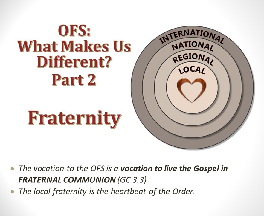 Para la mayoría de nosotros, nuestra experiencia de fraternidad llega a nivel local. Aunque encontramos fraternidad a nivel regional, nacional e internacional, la fraternidad local es el latido del corazón de la Orden. Es donde encontramos apoyo mutuo en nuestra fe. Es donde aprendemos a cumplir las promesas que hicimos en la profesión. La fraternidad es como un taller donde practicamos el parentesco universal; paciencia; humildad; sencillez ; y aceptación de los demás. Es donde mantenemos viva nuestra vocación. Si la vida de fraternidad se vive bien, aprenderemos a orar juntos y a trabajar juntos para hacer avanzar la fraternidad y la Iglesia. Aprendemos lo que es ser franciscano por cómo nos escuchamos unos a otros, aceptamos a los que son diferentes a nosotros y por cómo aprendemos juntos sobre el carisma franciscano. La fraternidad alimenta nuestra vocación y nos ayuda a llevar la alegría de conocer a Cristo a los demás, tanto dentro como fuera de la fraternidad en nuestra vida cotidiana.