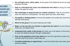 (en español abajo) Korean translation attached in a separate PDF. Please share with your local fraternity The Handbook for Servant Leadership, published by OFS-USA in 2010, contains a wealth of information that can guide us in being or becoming excellent servant leaders. For the next few weeks we will focus...